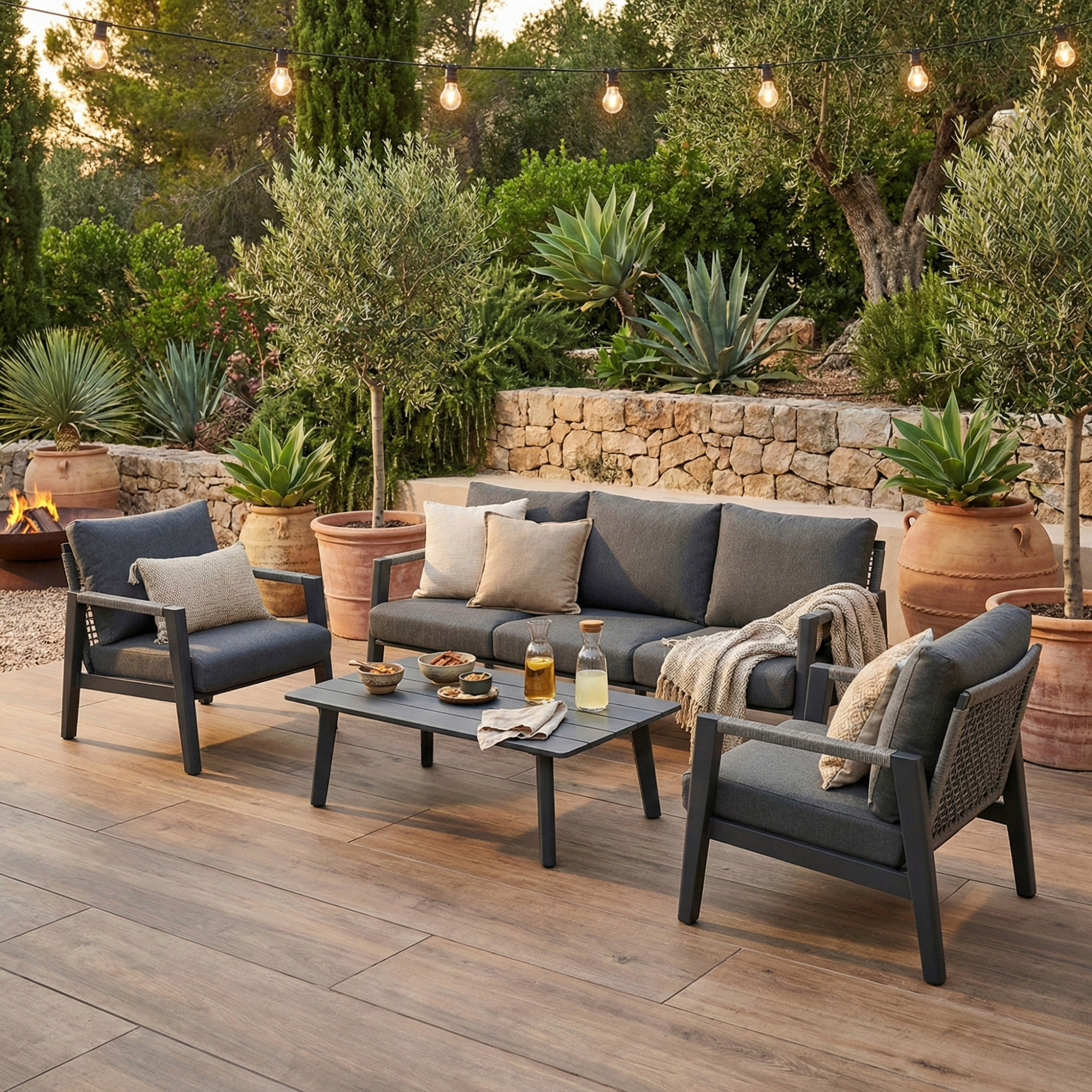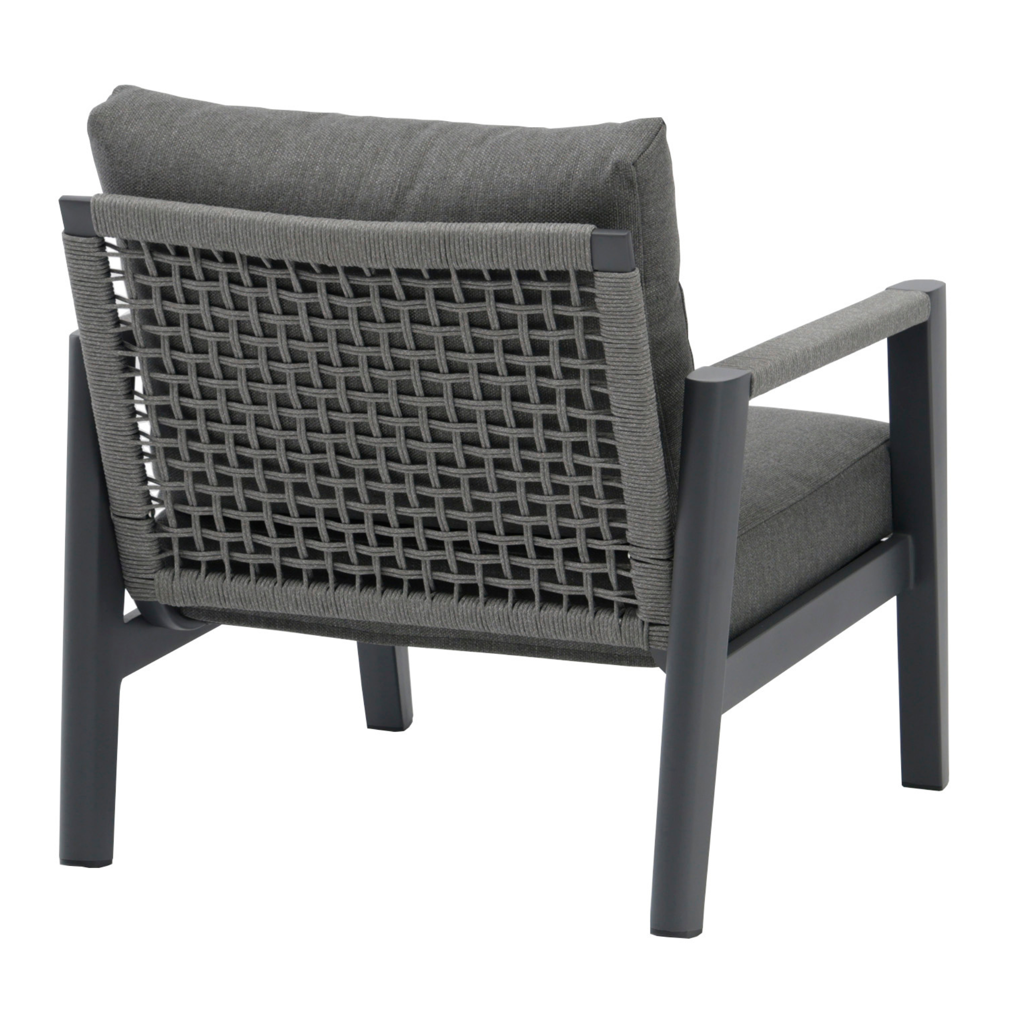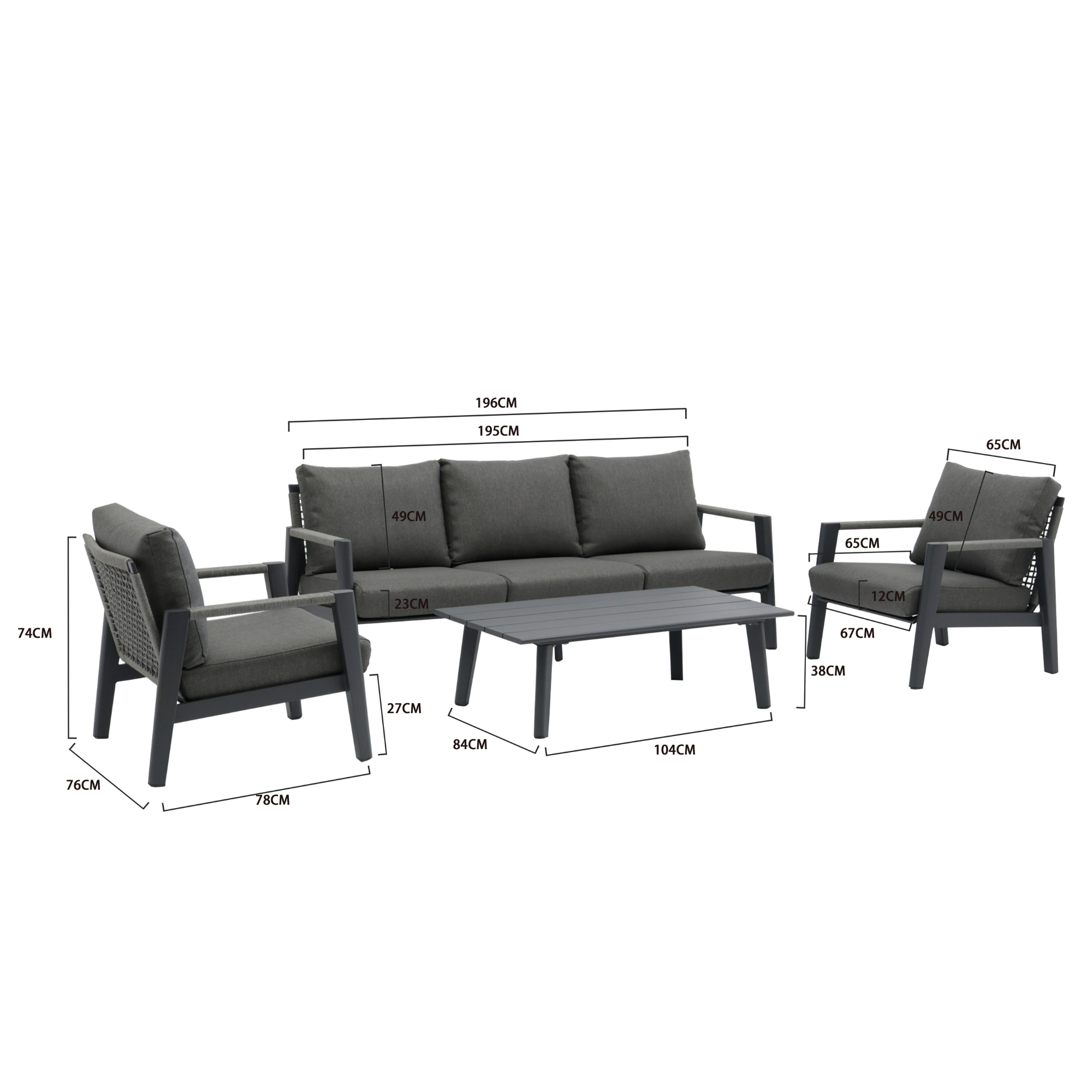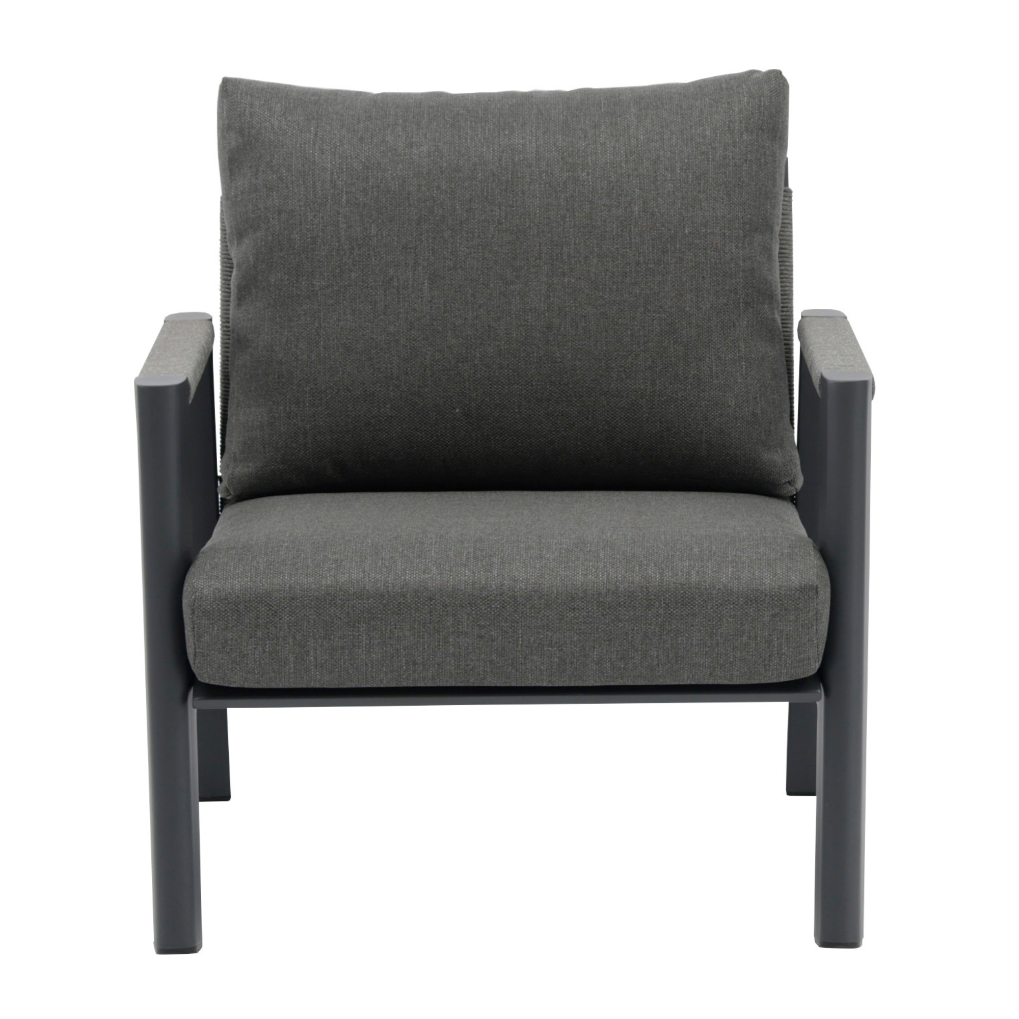 Set mobilier pentru exterior Hana, canapea 3 locuri, 2 fotolii si masuta, cadru din aluminiu, antracit